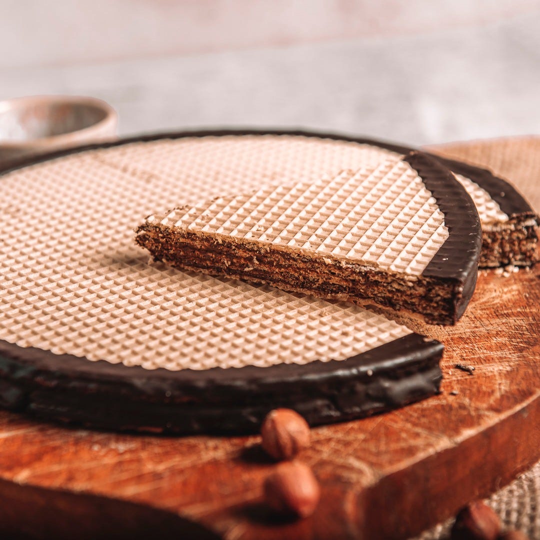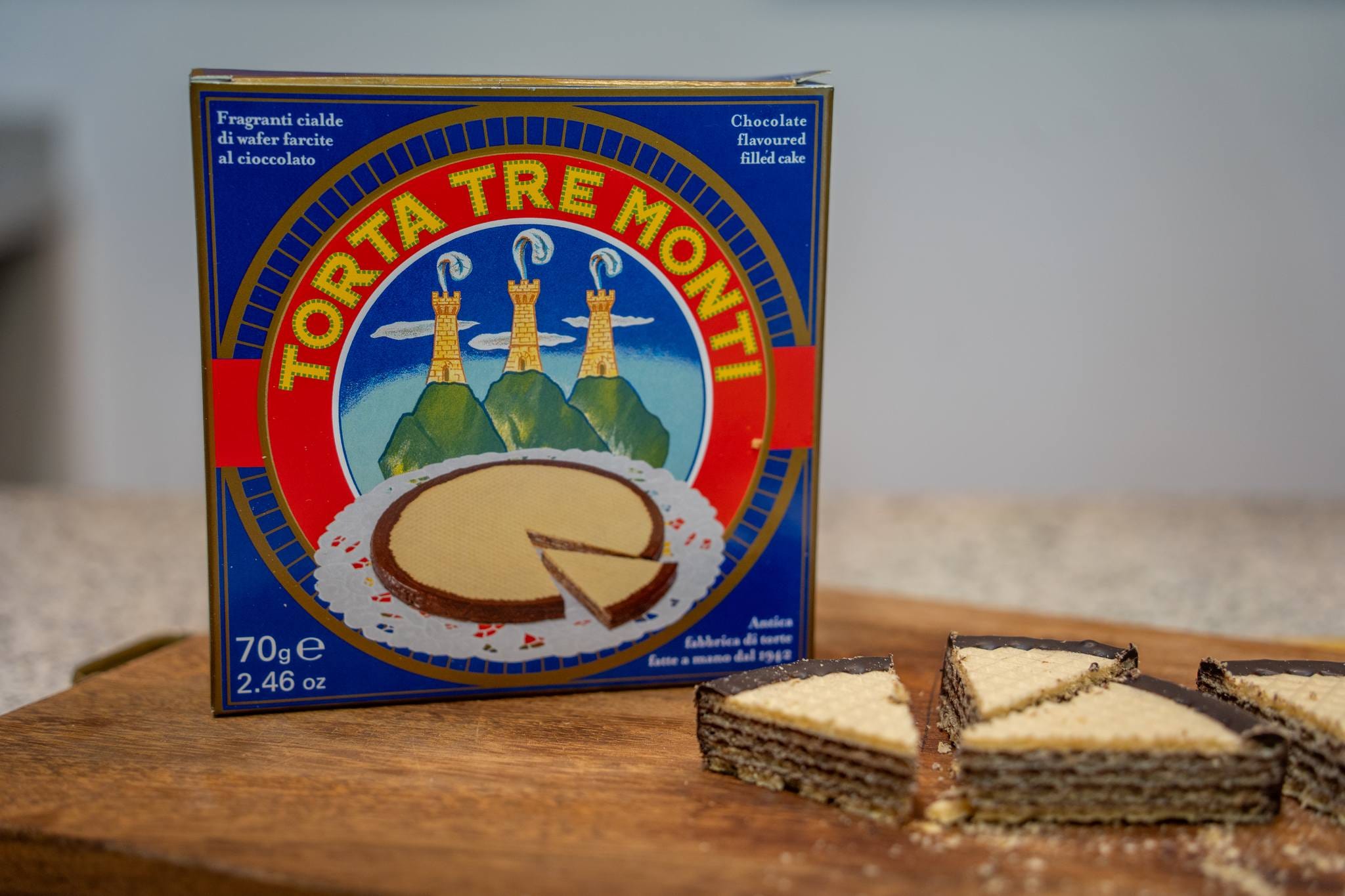 The Tre Monti Cake was first baked in 1942, right in the middle of World War II. San Marino, surrounded by fascist Italy, had become a refuge for thousands fleeing persecution - including an Austrian Jewish woman and her husband, who ended up helping distribute the cake across Italy. That friendship may have influenced the recipe: legend has it that the idea of using wafer layers came from her.